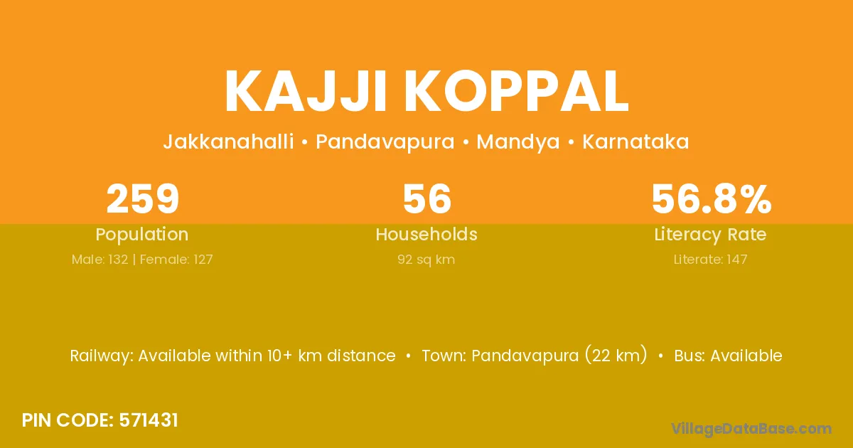 Pandavapura (22 km) is the nearest town to Kajji Koppal village for major economic activities and is located approximately 22 km away.