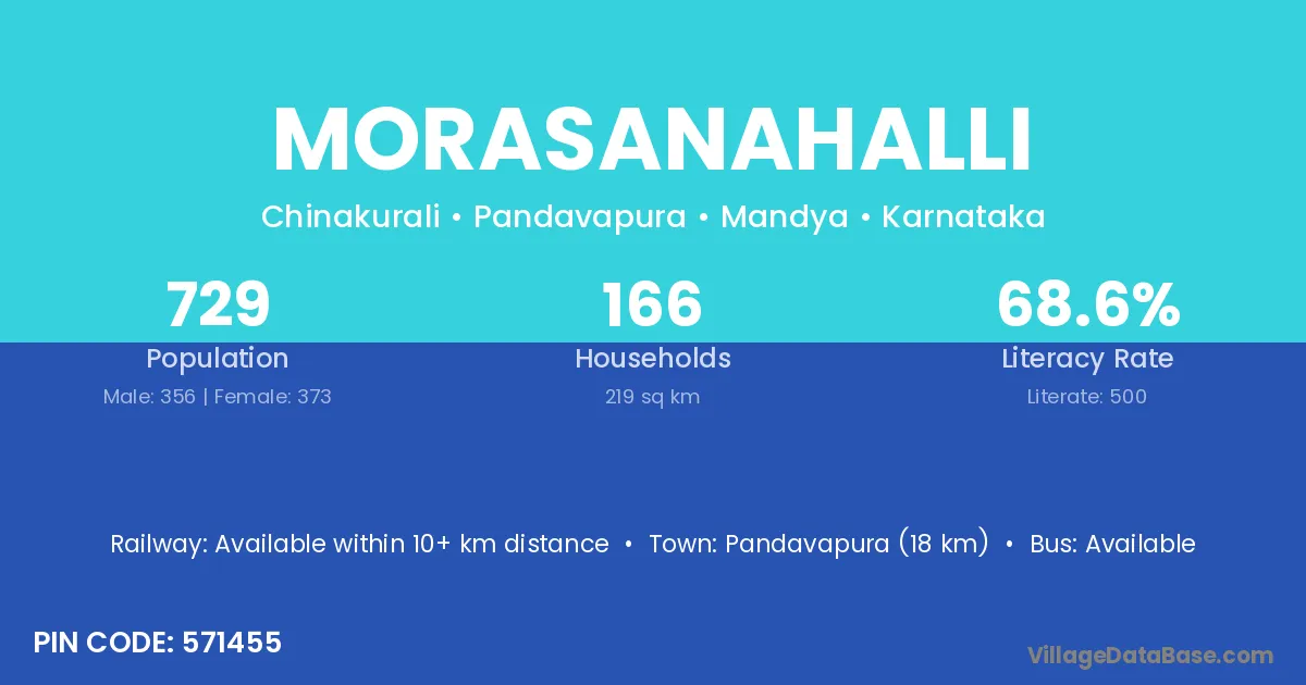Pandavapura (18 km) is the nearest town to Morasanahalli village for major economic activities and is located approximately 18 km away.