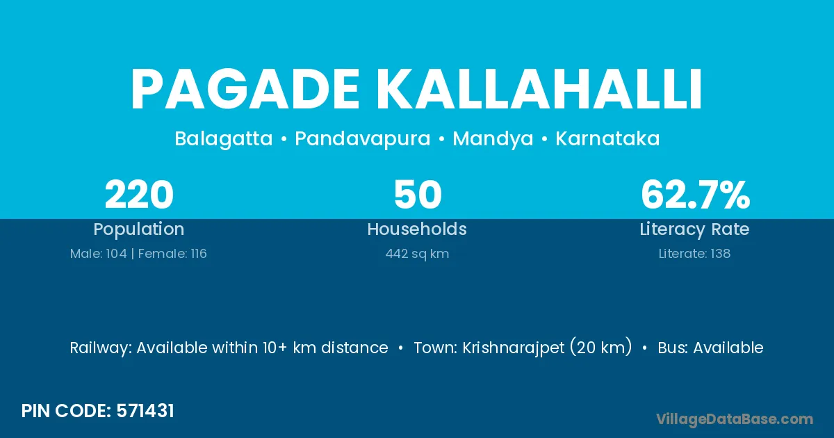 Pagade Kallahalli village has a total population of 220 people, of which 104 are males and 116 are females.