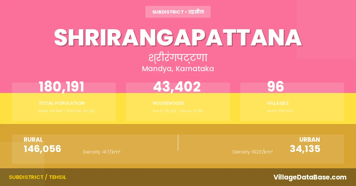 According to the 2011 census The total area of Shrirangapattana Taluka is 368 km², with a population of 180191 people. The population density is 490 inhabitants per square kilometre, and there are approximately 43402 houses in the sub district.