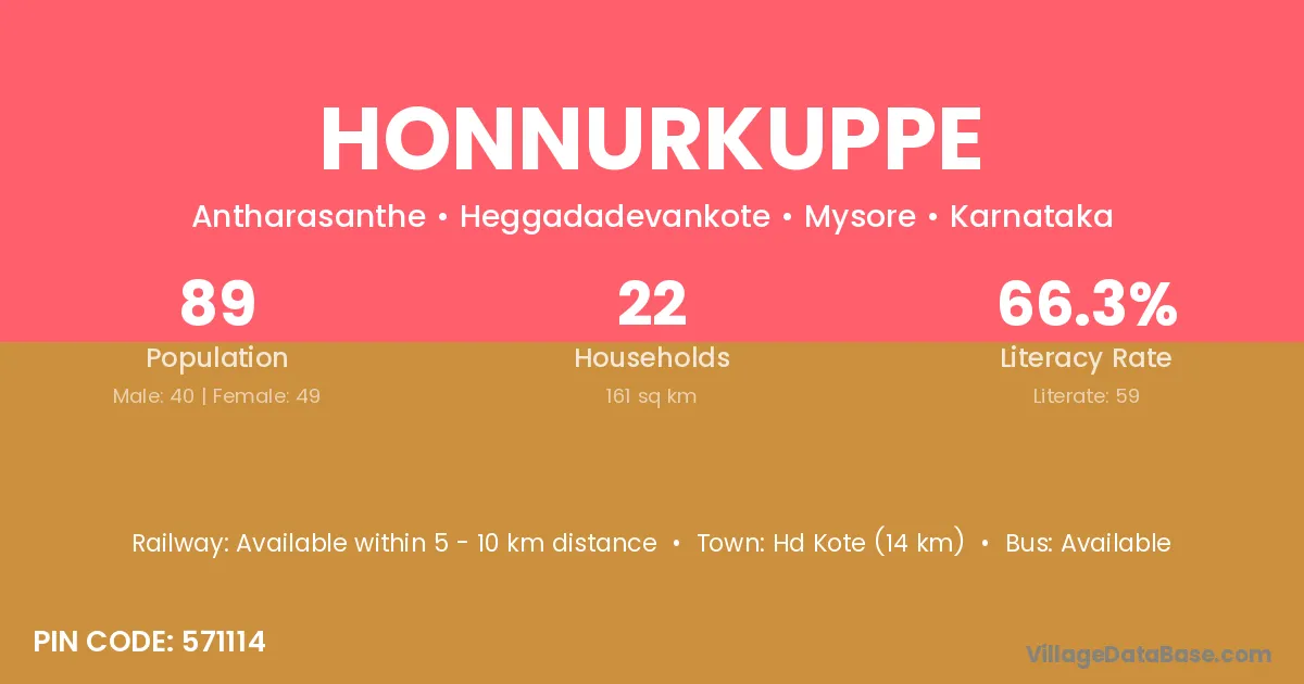 Hd Kote (14 km) is the nearest town to Honnurkuppe village for major economic activities and is located approximately 14 km away.