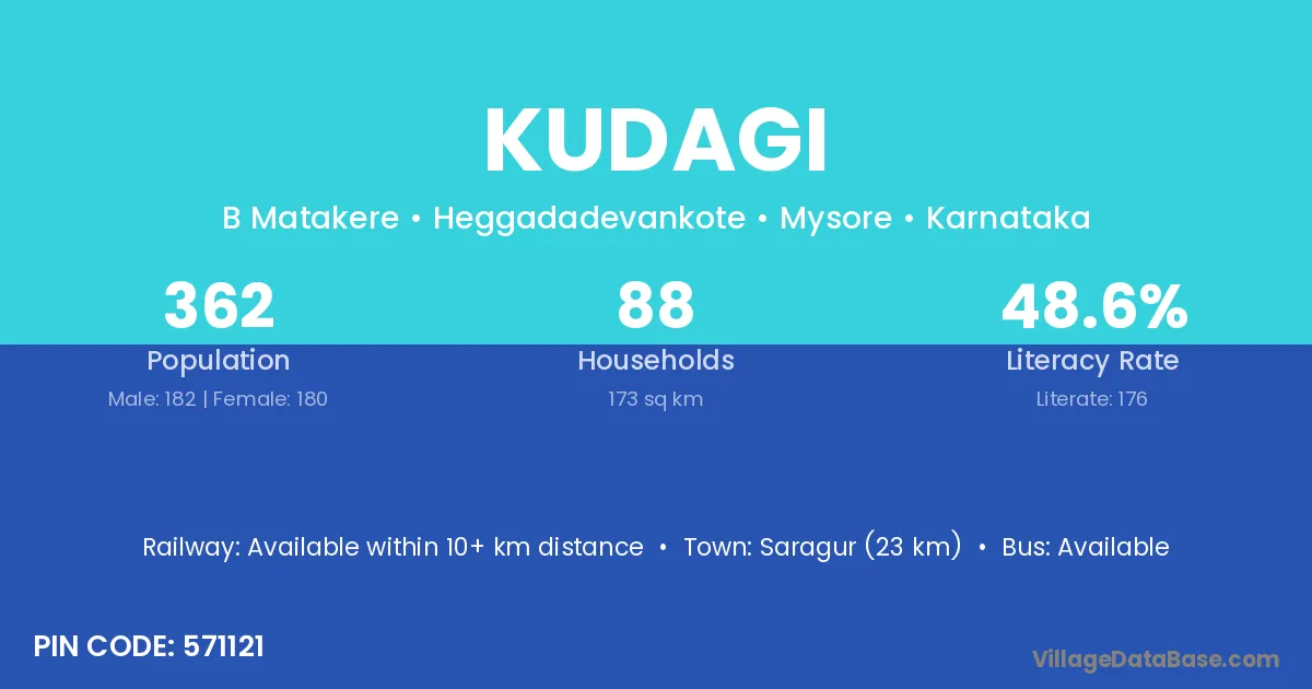Saragur (23 km) is the nearest town to Kudagi village for major economic activities and is located approximately 23 km away.