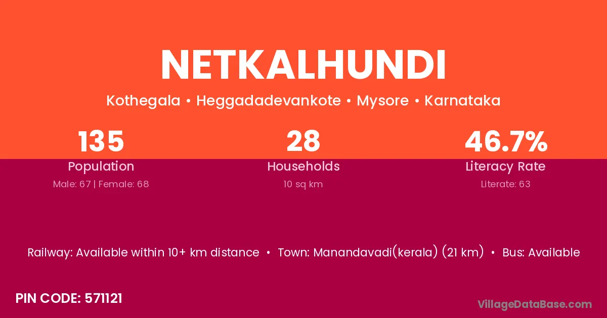 Manandavadi(kerala) (21 km) is the nearest town to Netkalhundi village for major economic activities and is located approximately 21 km away.