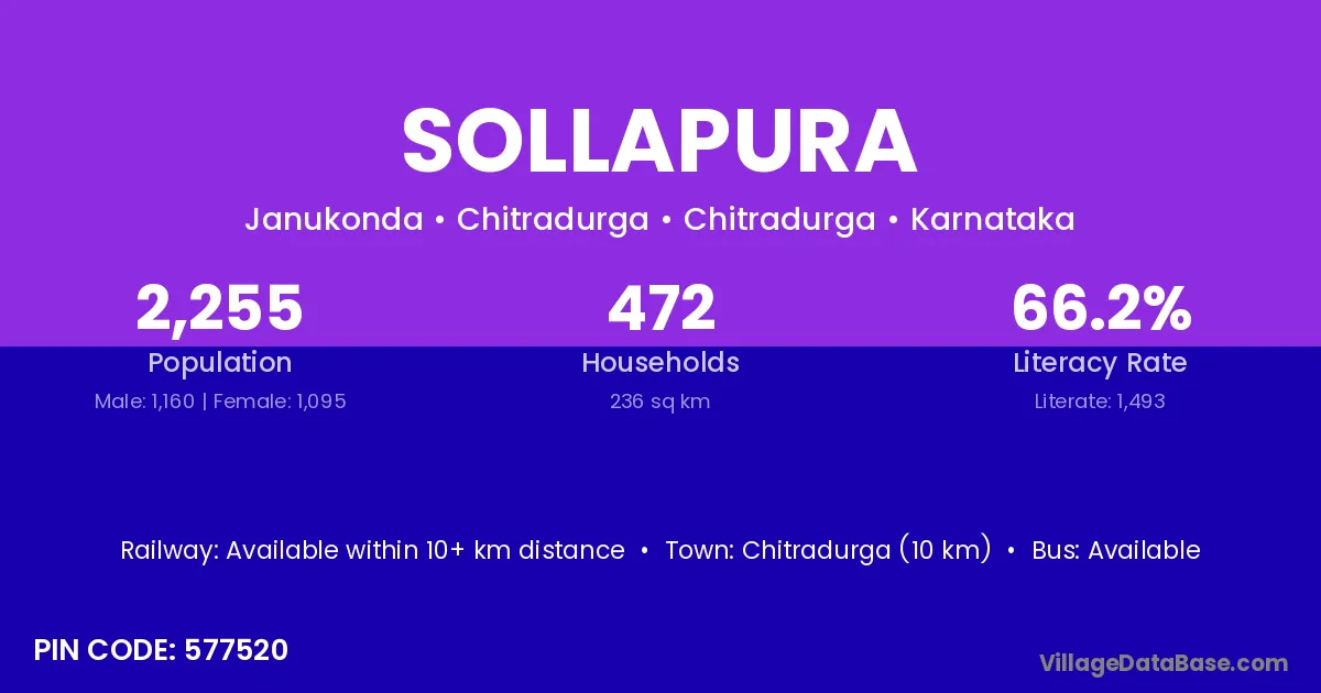 The literacy rate of Sollapura village is 61.83%. Male literacy stands at 68.57% and female literacy at 54.10%.