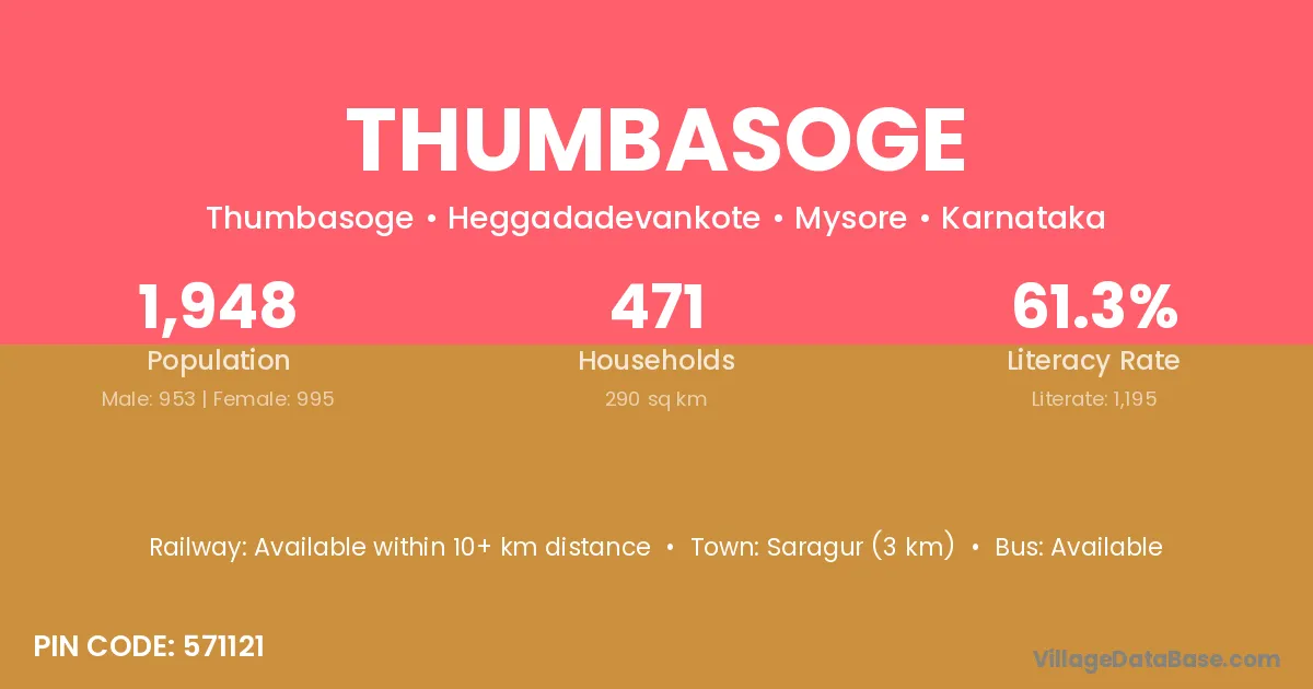 Saragur (3 km) is the nearest town to Thumbasoge village for major economic activities and is located approximately 3 km away.
