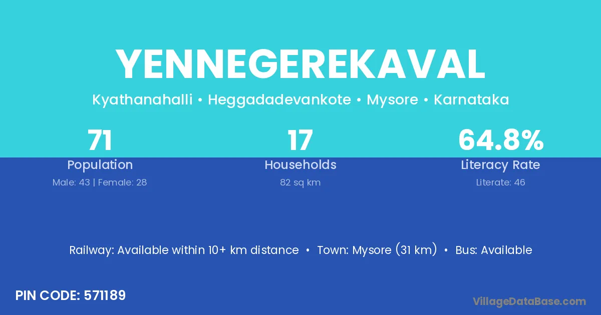 Mysore (31 km) is the nearest town to Yennegerekaval village for major economic activities and is located approximately 31 km away.