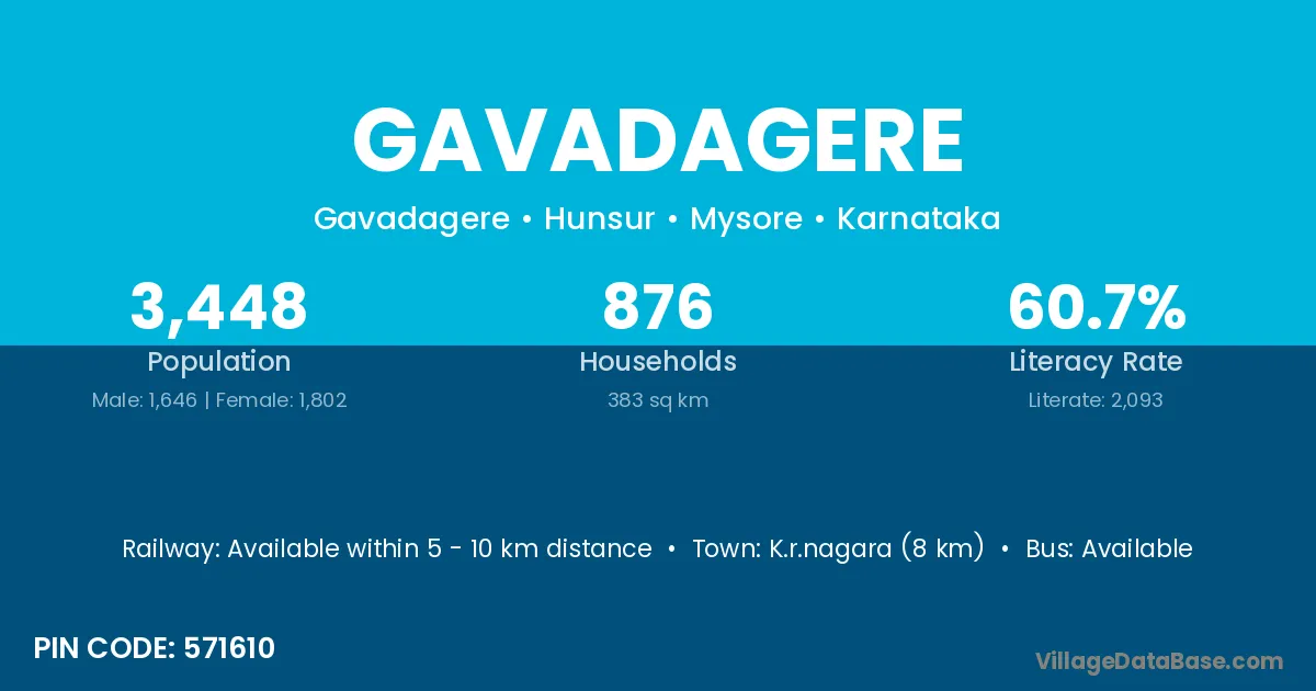 K.r.nagara (8 km) is the nearest town to Gavadagere village for major economic activities and is located approximately 8 km away.