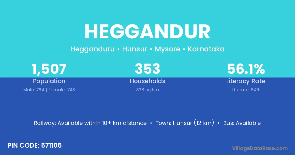 Hunsur (12 km) is the nearest town to Heggandur village for major economic activities and is located approximately 12 km away.