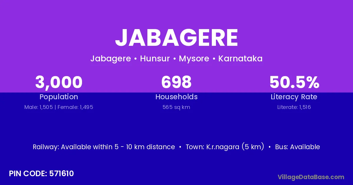 K.r.nagara (5 km) is the nearest town to Jabagere village for major economic activities and is located approximately 5 km away.
