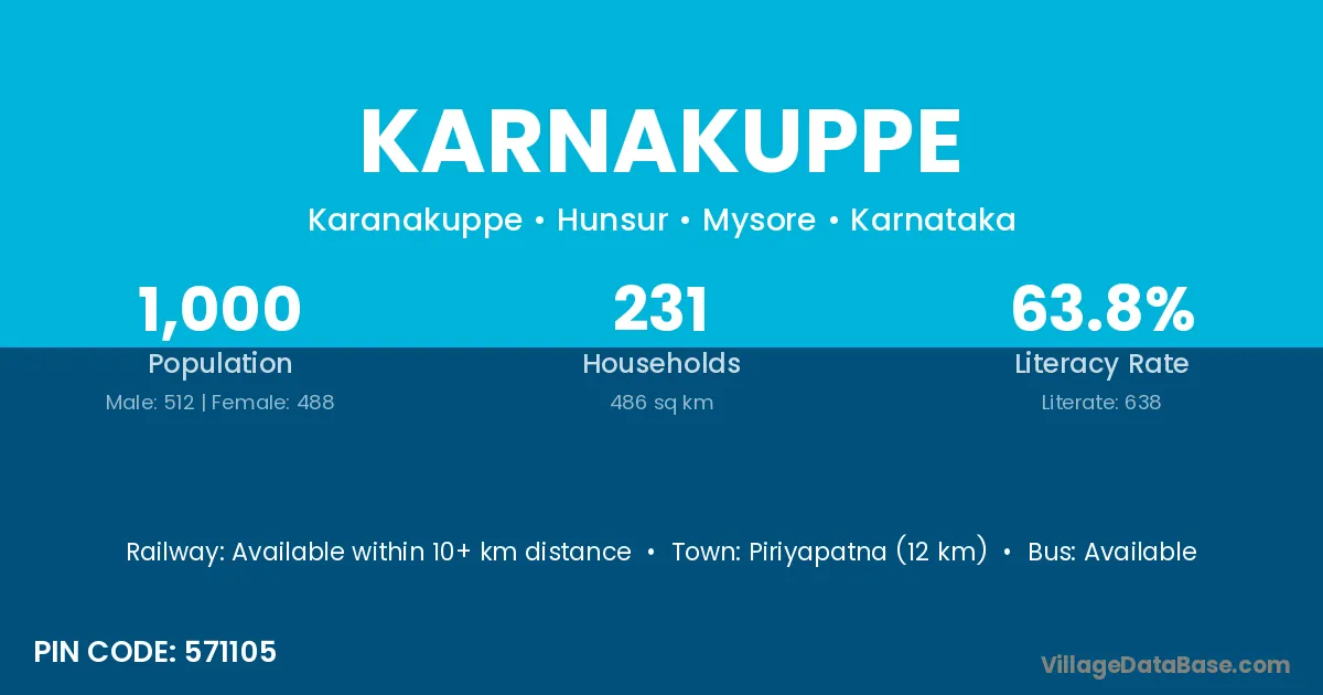 Piriyapatna (12 km) is the nearest town to Karnakuppe village for major economic activities and is located approximately 12 km away.