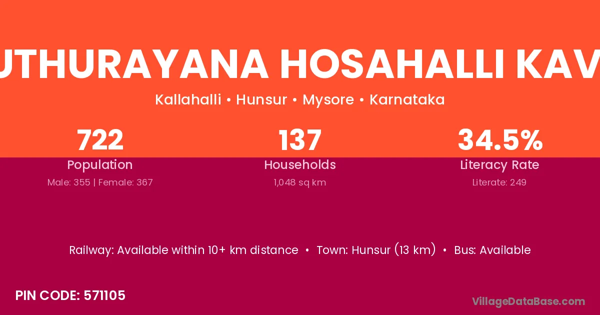 Hunsur (13 km) is the nearest town to Muthurayana Hosahalli Kaval village for major economic activities and is located approximately 13 km away.