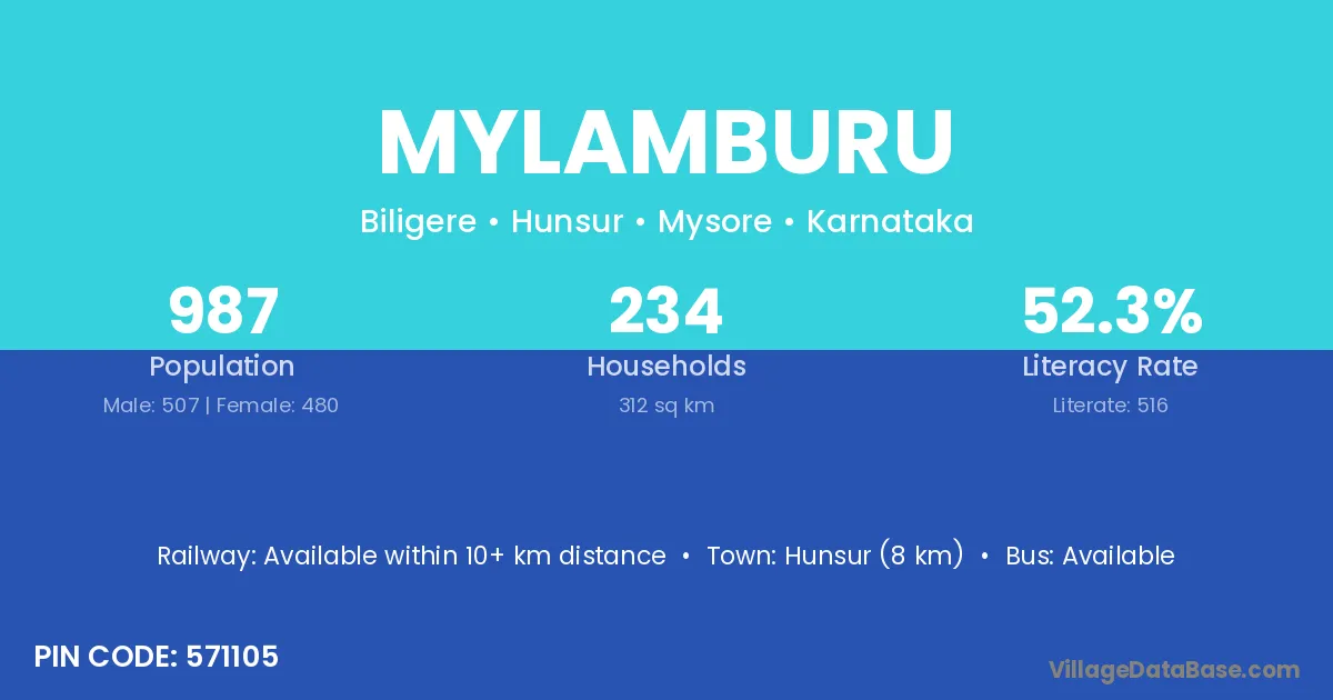 Hunsur (8 km) is the nearest town to Mylamburu village for major economic activities and is located approximately 8 km away.