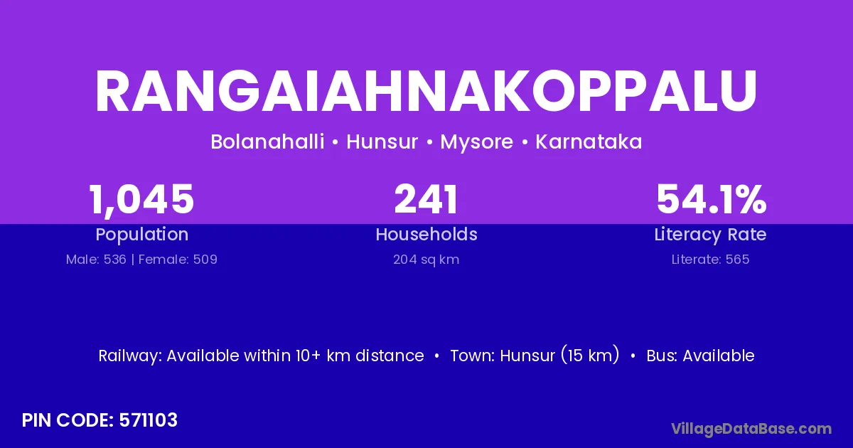 Rangaiahnakoppalu village has a total population of 1,045 people, of which 536 are males and 509 are females.