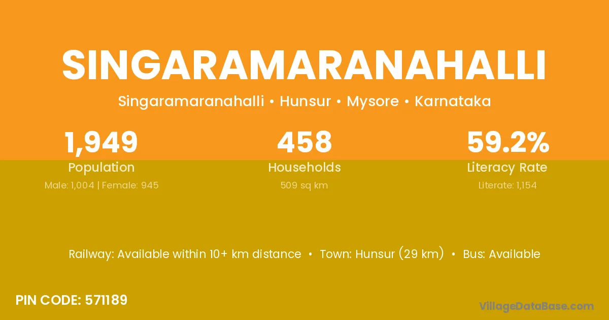 Hunsur (29 km) is the nearest town to Singaramaranahalli village for major economic activities and is located approximately 29 km away.