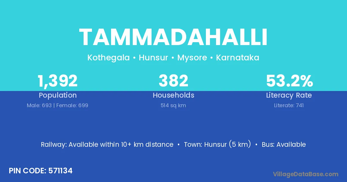 Hunsur (5 km) is the nearest town to Tammadahalli village for major economic activities and is located approximately 5 km away.