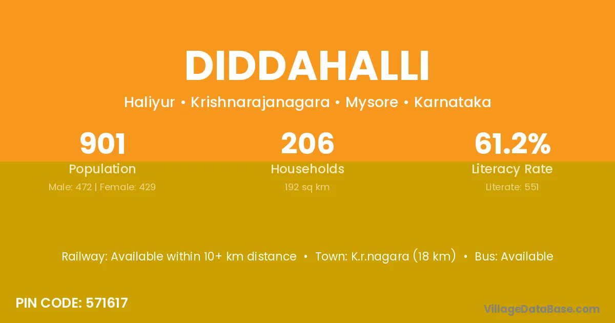 K.r.nagara (18 km) is the nearest town to Diddahalli village for major economic activities and is located approximately 18 km away.