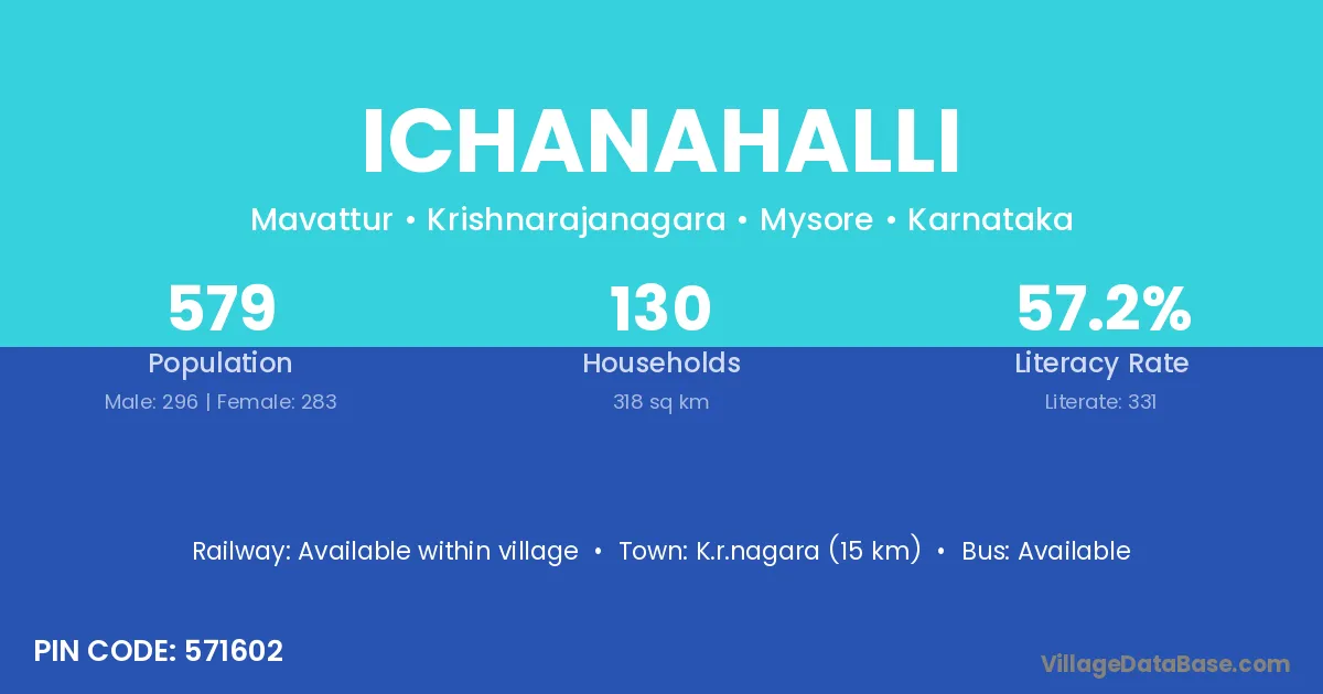 Ichanahalli village has a total population of 579 people, of which 296 are males and 283 are females.