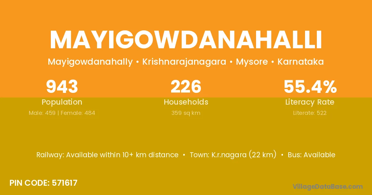 Mayigowdanahalli village has a total population of 943 people, of which 459 are males and 484 are females.