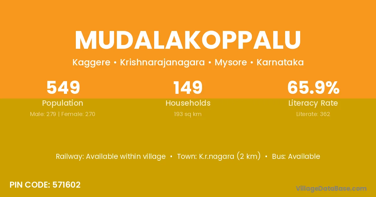 Mudalakoppalu village has a total population of 549 people, of which 279 are males and 270 are females.