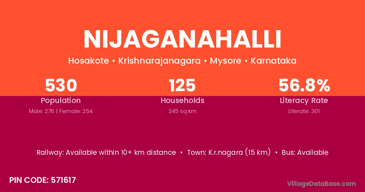 K.r.nagara (15 km) is the nearest town to Nijaganahalli village for major economic activities and is located approximately 15 km away.