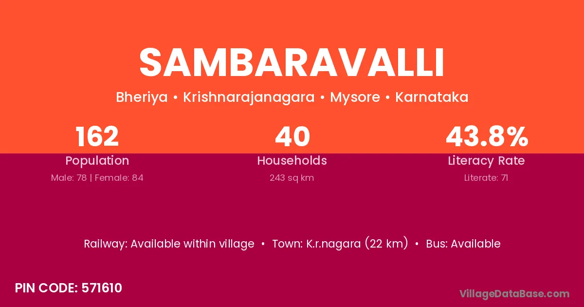 K.r.nagara (22 km) is the nearest town to Sambaravalli village for major economic activities and is located approximately 22 km away.