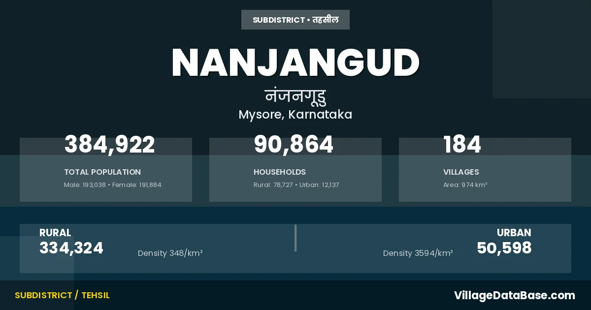 According to the 2011 census The total area of Nanjangud Taluka is 974 km², with a population of 384922 people. The population density is 395 inhabitants per square kilometre, and there are approximately 90864 houses in the sub district.