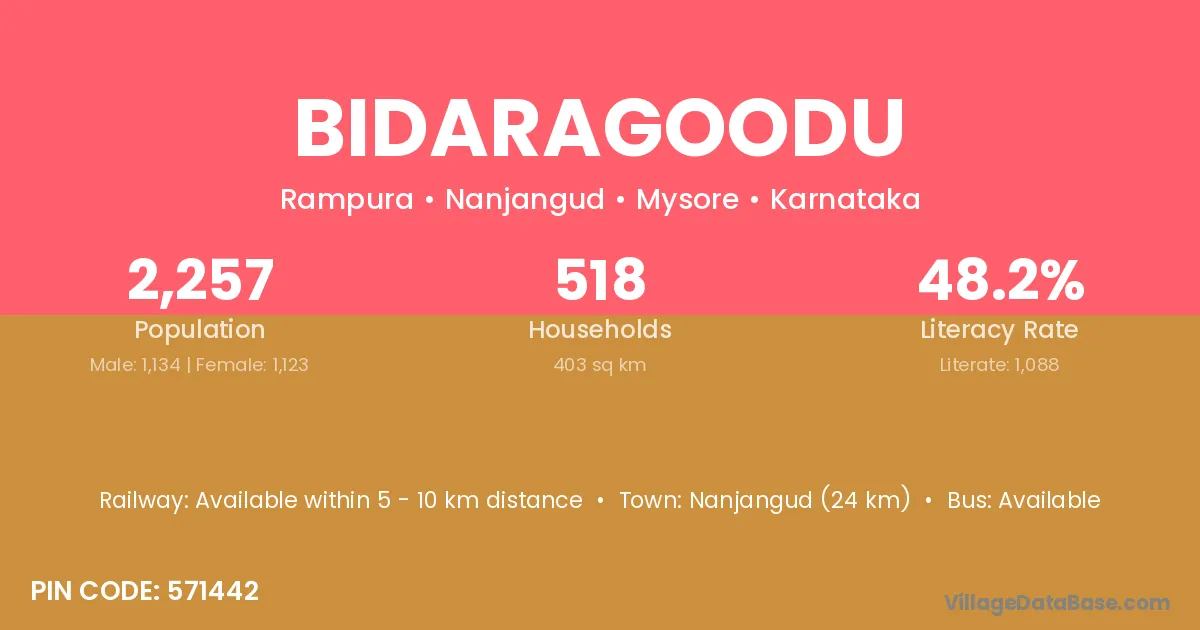 Nanjangud (24 km) is the nearest town to Bidaragoodu village for major economic activities and is located approximately 24 km away.