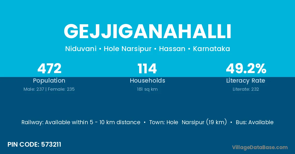 T. Narsipur (8 km) is the nearest town to Gejjiganahalli village for major economic activities and is located approximately 8 km away.