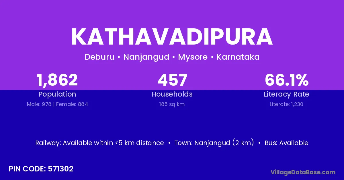 Nanjangud (2 km) is the nearest town to Kathavadipura village for major economic activities and is located approximately 2 km away.