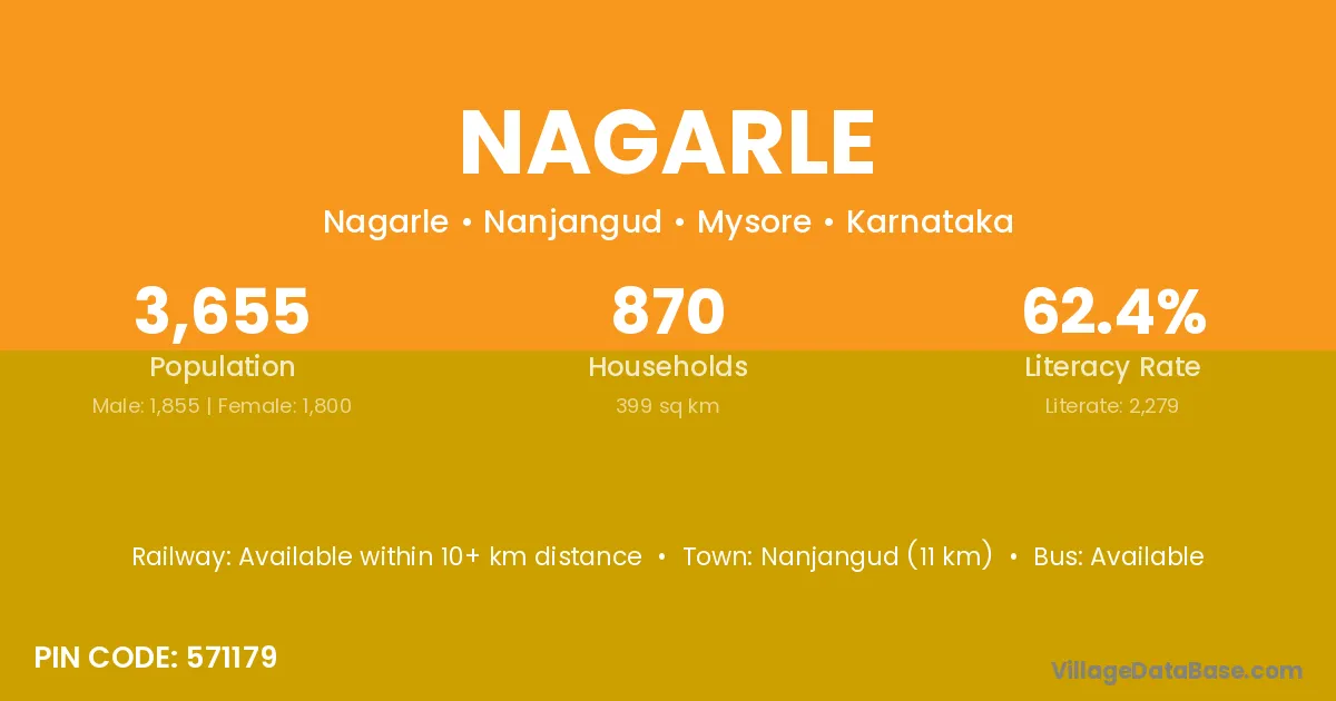 Nanjangud (11 km) is the nearest town to Nagarle village for major economic activities and is located approximately 11 km away.