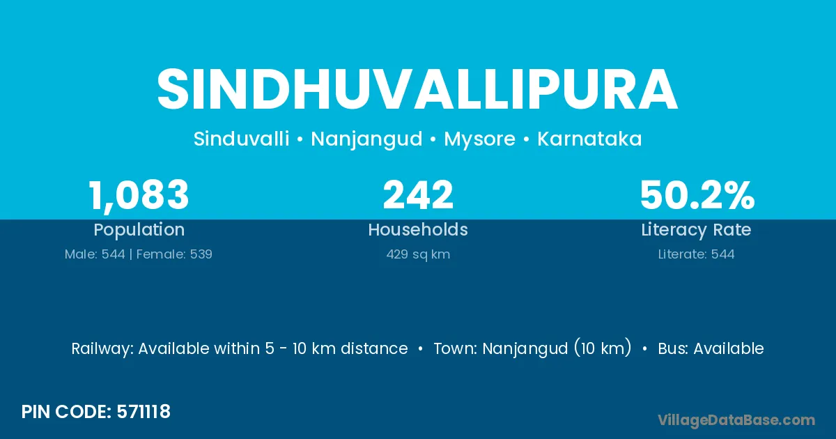 Sindhuvallipura village has a total population of 1,083 people, of which 544 are males and 539 are females.