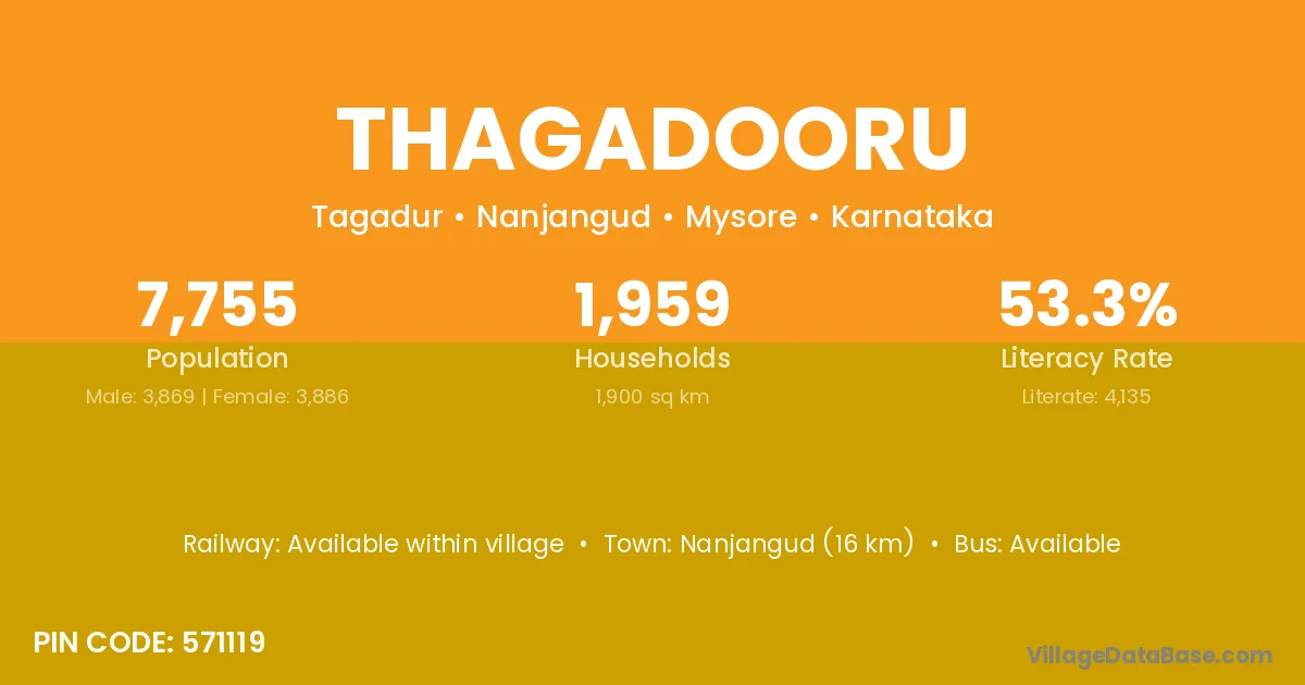 Nanjangud (16 km) is the nearest town to Thagadooru village for major economic activities and is located approximately 16 km away.