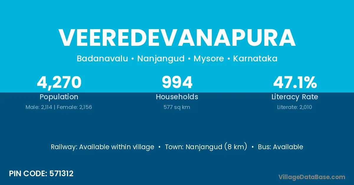 Nanjangud (8 km) is the nearest town to Veeredevanapura village for major economic activities and is located approximately 8 km away.