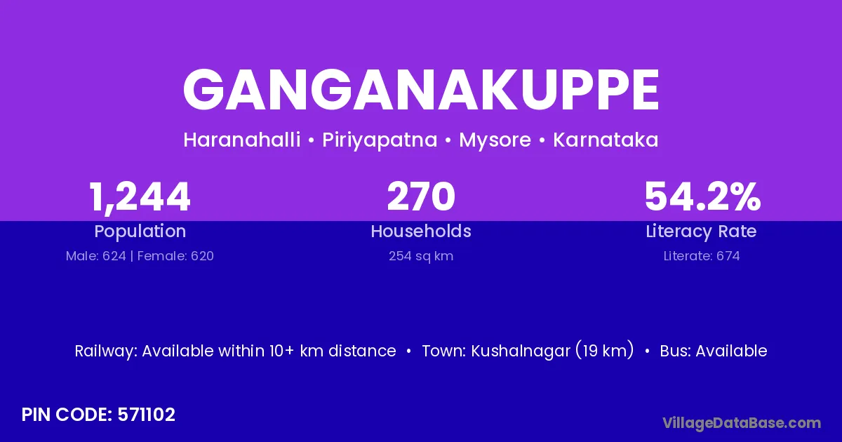 Ganganakuppe village has a total population of 1,244 people, of which 624 are males and 620 are females.