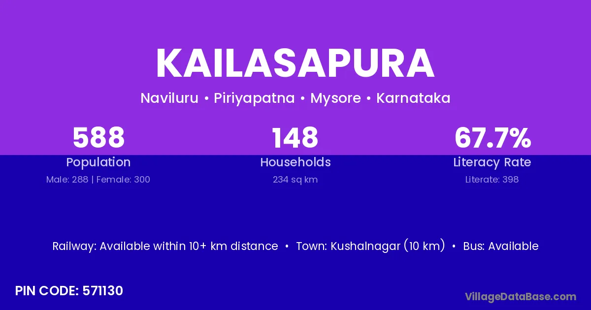 Kushalnagar (10 km) is the nearest town to Kailasapura village for major economic activities and is located approximately 10 km away.