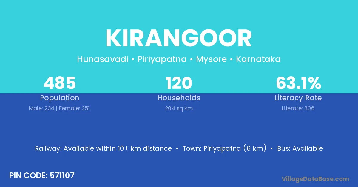 Piriyapatna (6 km) is the nearest town to Kirangoor village for major economic activities and is located approximately 6 km away.