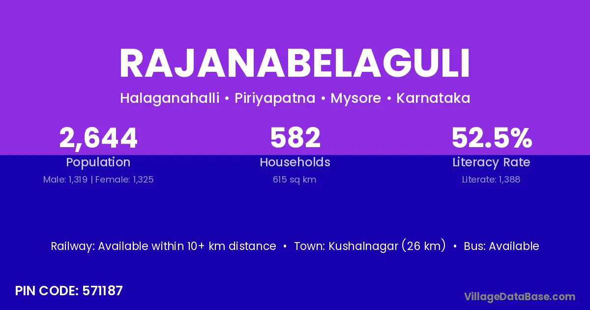 Kushalnagar (26 km) is the nearest town to Rajanabelaguli village for major economic activities and is located approximately 26 km away.