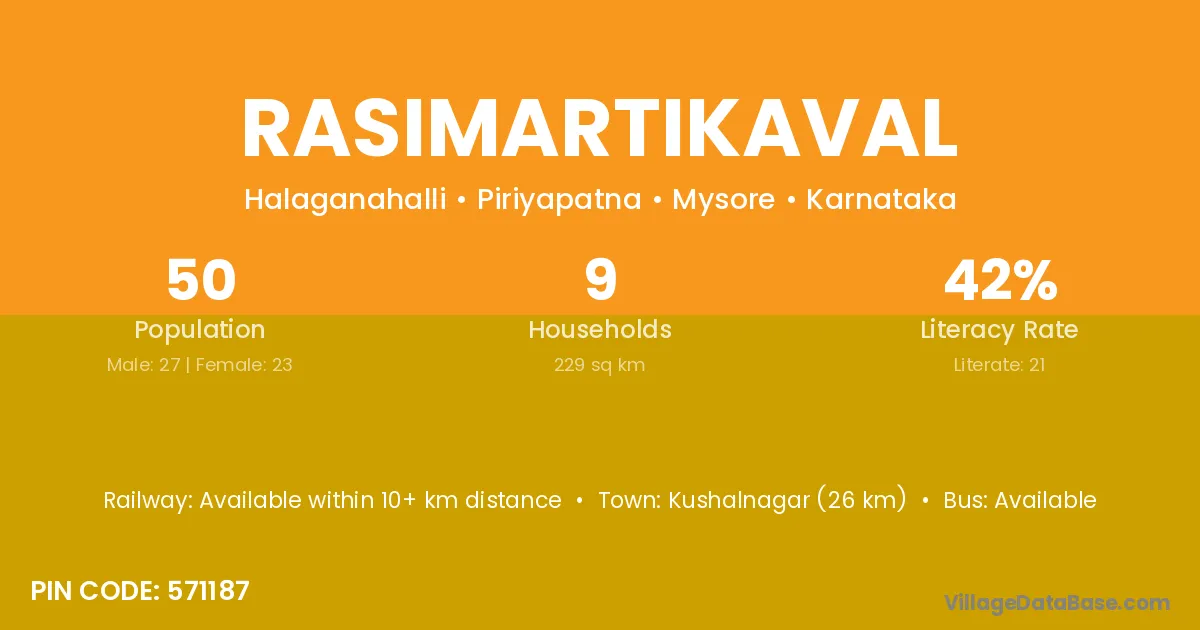 Kushalnagar (26 km) is the nearest town to Rasimartikaval village for major economic activities and is located approximately 26 km away.