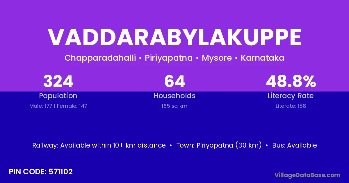 Piriyapatna (30 km) is the nearest town to Vaddarabylakuppe village for major economic activities and is located approximately 30 km away.