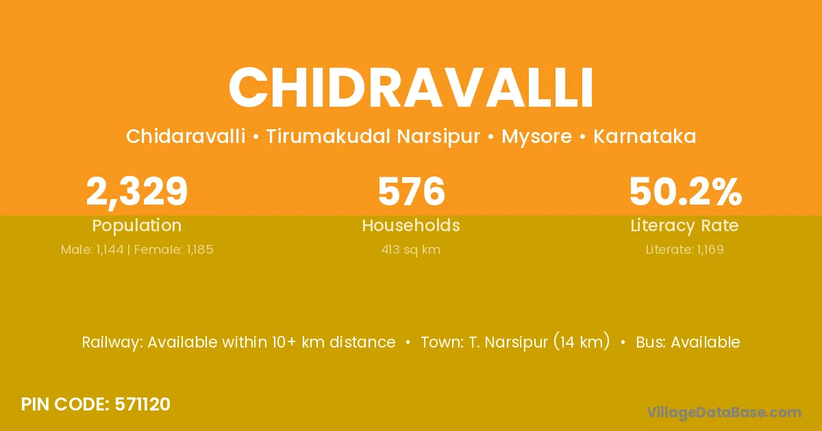 T. Narsipur (14 km) is the nearest town to Chidravalli village for major economic activities and is located approximately 14 km away.