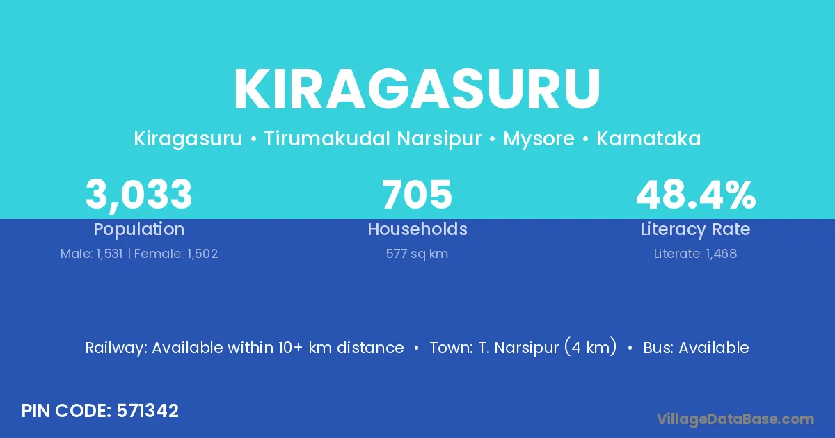 T. Narsipur (4 km) is the nearest town to Kiragasuru village for major economic activities and is located approximately 4 km away.