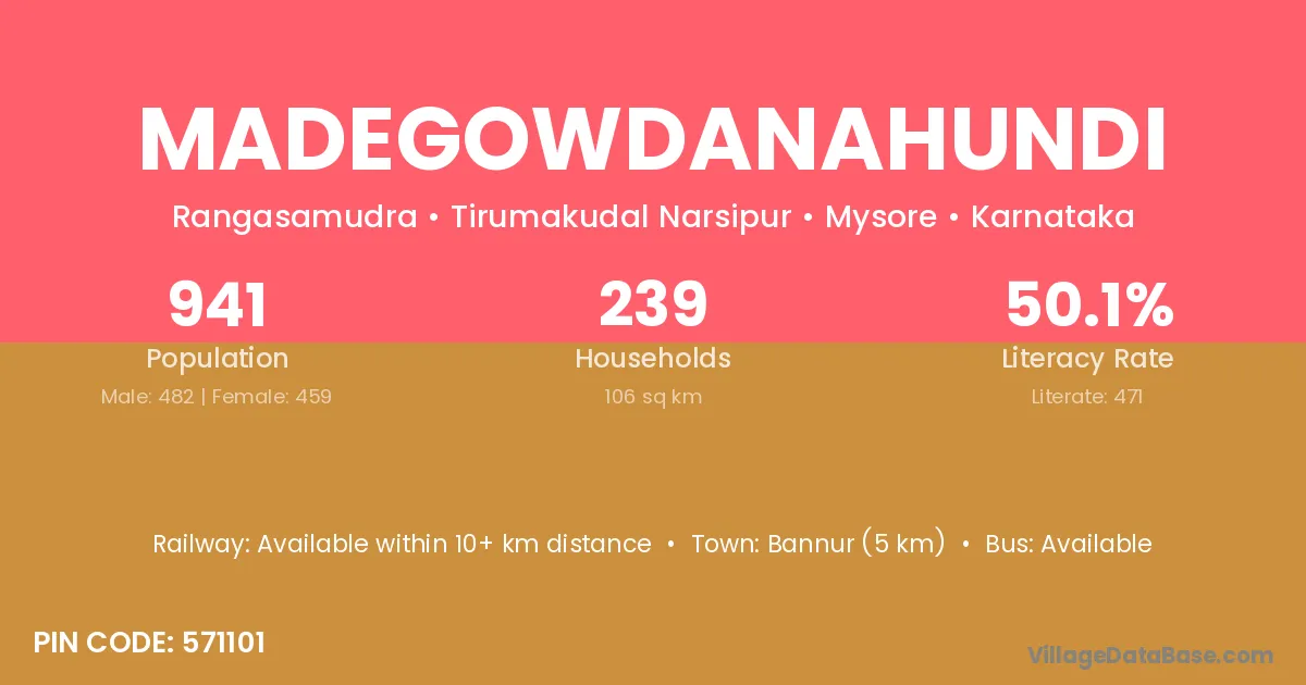Madegowdanahundi village has a total population of 941 people, of which 482 are males and 459 are females.