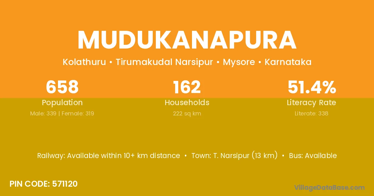 T. Narsipur (13 km) is the nearest town to Mudukanapura village for major economic activities and is located approximately 13 km away.