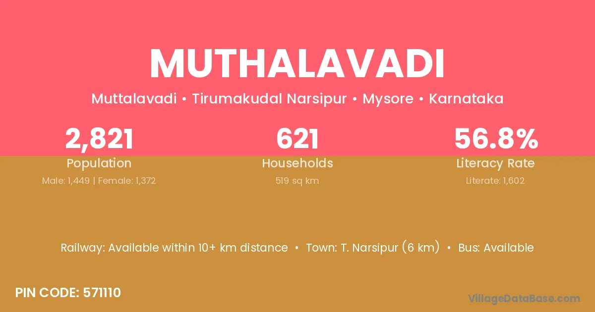 T. Narsipur (6 km) is the nearest town to Muthalavadi village for major economic activities and is located approximately 6 km away.