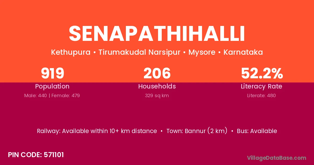 Bannur (2 km) is the nearest town to Senapathihalli village for major economic activities and is located approximately 2 km away.