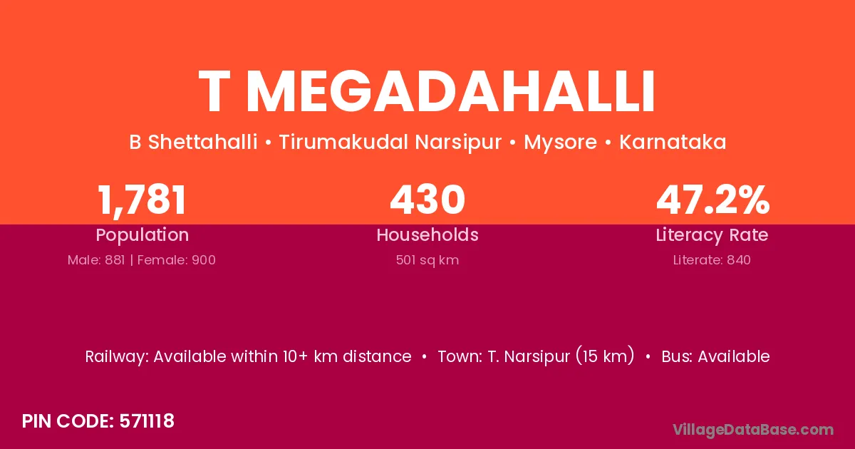 T. Narsipur (15 km) is the nearest town to T Megadahalli village for major economic activities and is located approximately 15 km away.