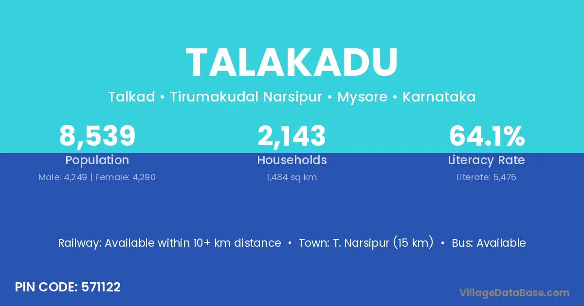 Talakadu village has a total population of 8,539 people, of which 4,249 are males and 4,290 are females.