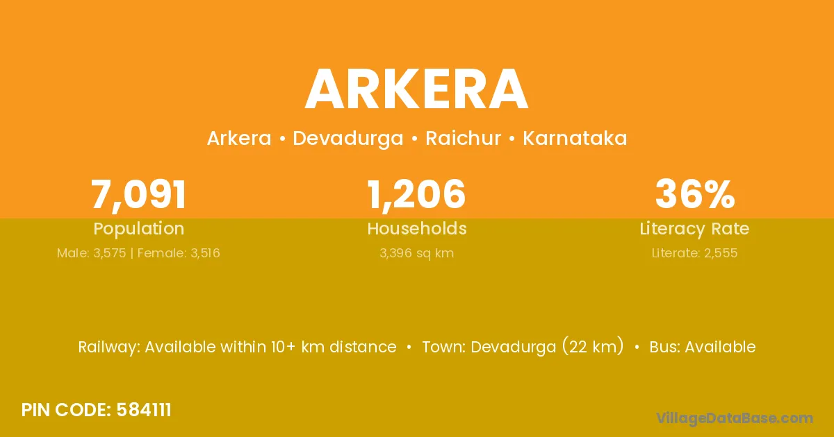 Devadurga (22 km) is the nearest town to Arkera village for major economic activities and is located approximately 22 km away.