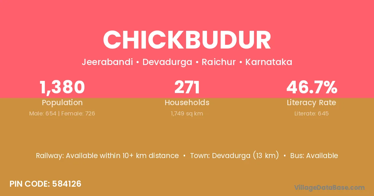 Devadurga (13 km) is the nearest town to Chickbudur village for major economic activities and is located approximately 13 km away.