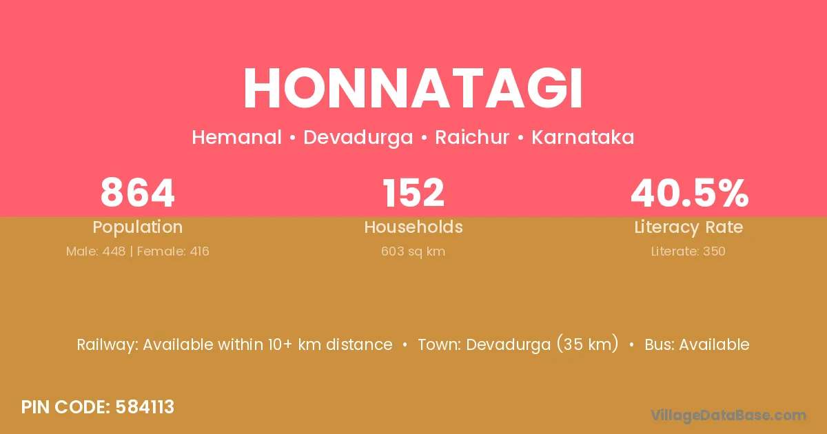 Devadurga (35 km) is the nearest town to Honnatagi village for major economic activities and is located approximately 35 km away.